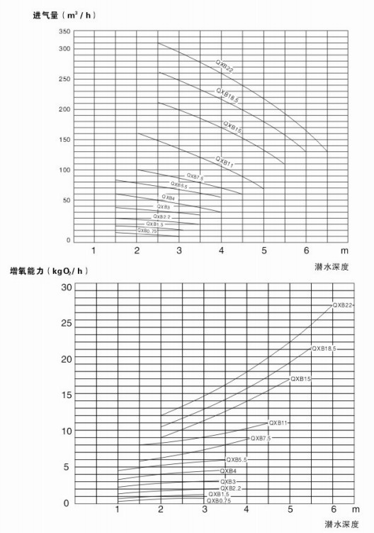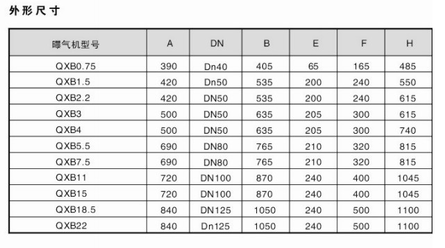 QXB型潛水離心式曝氣機采用電機和葉輪直接傳動,利用葉輪旋轉所產生的離心力排開周圍水形成低壓區吸入水流同時,在葉輪進口處制造真空而吸入空氣,在混氣室中氣與水充分混合形成均勻的氣水混合液,在離心力作用下快速排出。