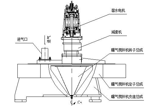 SBJ產(chǎn)品由潛水電機、減速裝置、葉輪、混合室、底座、輸氣管、起吊鏈組成。如圖